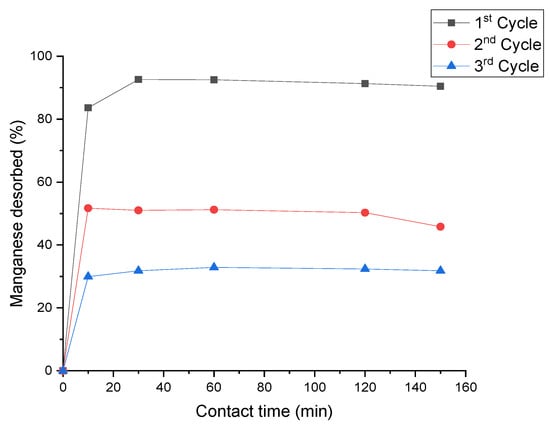 Figure 10 shows the desorption of manganese by the BBP adsorbent. The experiment was run at the optimum condition obtained in the adsorption study, which is 0.1 M HCL acid, 0.5 g BBP adsorbent, and 150 min. A low concentration of HCL acid was used for the effective desorption process as the reaction is more stable. In the first cycle, high desorption of manganese of 92% was attained in 30 min. The recovery of the BBP adsorbent using HCL acid demonstrates a high percentage of manganese desorbed in 5 min, reaching a maximum in 30 min. However, the desorption efficiency was decreased to 51% in the second cycle and further decreased to 32% in the third cycle. The loss rate after the third cycle desorption was 60%. This might be attributed to the loss of functional groups on the BBP adsorbent surface during the regeneration process, as well as inadequate desorption. Long-term elution can cause the binding site to be destroyed or manganese ions to be left in the adsorbent [].
