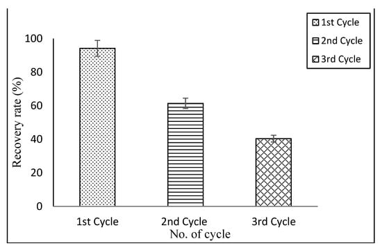 Figure 11 shows the recovery of the BBP adsorbent for manganese removal. The recovery rate in the first cycle was 94.18% and decreased to 61.38% in the second cycle, followed by 40.39% in the third cycle. This showed that the adsorption recovery was effective in the first cycle but was gradually decreased in the second and third cycles. This finding shows that the BBP adsorbent has potential reusability and efficiency for reuse after the first cycle of the desorption process. As the number of desorption cycles increases, the active binding sites on the adsorbent are gradually destroyed after each cycle. As a result, the regenerated adsorbent’s performance is inferior to that of the freshly manufactured adsorbent. The saturation and occupancy of adsorption sites with firmly adsorbed adsorbate can also induce a reduction in desorption efficiency []. Furthermore, certain chemical reagents can alter the chemical structure of adsorbents by reacting with certain of the adsorbent’s components []. As HCL acid weakens certain active sites in the adsorbent by leaching some ions into the desorbing solution with each desorbing cycle, the adsorbent’s adsorption capacity will be reduced.