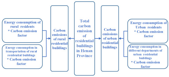 To solve the abovementioned problems, the energy balance sheet splitting method was adopted in this paper. Based on the relevant data in the energy balance sheet of Henan Province, we split the various energy consumed by residential buildings and calculated the carbon emission factor of energy. Residential buildings were divided into rural and urban residential buildings. The historical data of carbon emissions from residential buildings in Henan were measured, and the influencing factors of carbon emissions were analyzed for the two types of residential buildings. The Kaya-LMDI decomposition method was used to reveal the contribution of each influencing factor to the growth of carbon emission intensity in Henan within a specific period from the perspective of household size, and the historical carbon emission reduction of residential buildings in Henan was evaluated.
