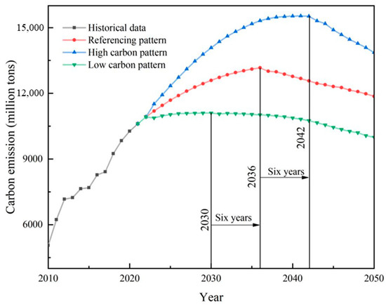 Based on the base value settings above, the evolution trend of residential building carbon emissions in Henan Province under the low-carbon, baseline, and high-carbon scenarios can be obtained as shown below.