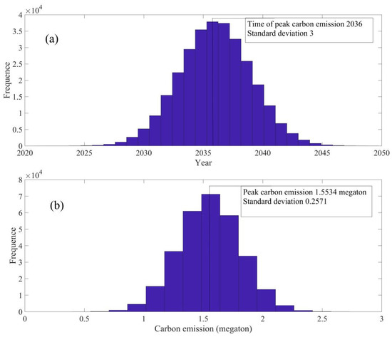 Uncertainty (a) amount and (b) time of peak carbon emissions for the residential building carbon emission in Henan Province.