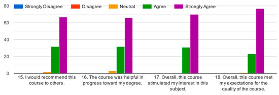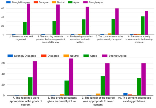 Figure 4 shows the results of respondents’ answers on learning outcomes. Evaluating learning outcomes is critical to measuring the success of a course. Although online quizzes or other types of assessments can be used for evaluation, it is valuable to gather learners’ opinions on the final outcome. The primary goal of an online course is to move learners from one level of knowledge to another, so it is important to determine whether this goal has been met, and to what extent, and to identify opportunities to improve the course for future learners. According to the survey results, participants agreed or strongly agreed that the courses helped them achieve additional competencies and skills.