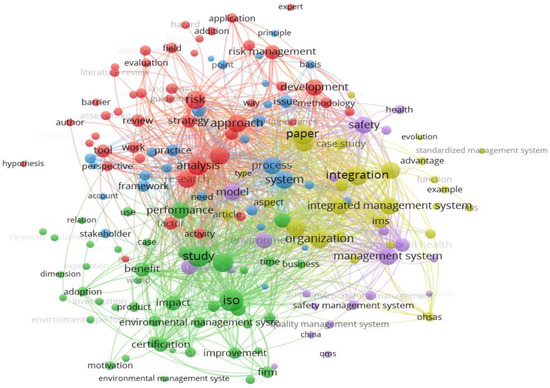 The generated maps are visually informing about the most important elements in the analysis: risk, performance, management system, organization, model, and so on, as it is shown in Figure 2. They are directly connected with the purpose of the paper and highlight the relevant links in the field. The map includes 167 items classified in 5 clusters represented through different color fields. The biggest class in this map is class 1 with 46 items, pictured in red, and contains the elements with the most occurrences in all the analyzed articles, followed by the second class in green which has 44 elements and has the co-occurrence elements of the first cluster elements. The third class is in blue with 29 terms; the fourth group has 27 terms in dark yellow; and the last class is presented in purple with 21 items.