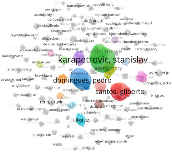 Figure 3 shows the main authors that contribute to the topics of the present review. The main influence in the domain of integrated management systems is realized by Karaperovic [28,57,58,59,60,61]; Domingues [3,62,63,64,65,66]; and Santos [36,67,68,69,70,71], but it must be mentioned that not all the authors showed in the map are concerned about the management of the risks.