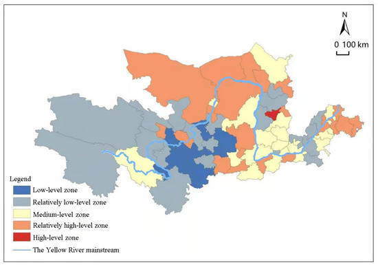 Based on the mean health index of residents in individual prefecture-level cities (leagues and prefectures) in the YRB, the natural breakpoint method was used to classify them into five categories, using ArcGIS software; these categories were the high-level zone, relatively high-level zone, medium-level zone, relatively low-level zone, and low-level zone (Figure 2).
