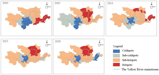 For the present study, we selected the years 2000, 2005, 2010, 2015, and 2020 to further quantify the values and generate a spatial evolution map displaying both coldspots and hotspots, based on which the local spatial relationship of the health index of residents in the YRB could be further analyzed (Figure 3). In 2000, the hotspots were mainly distributed in the eastern and central regions of the YRB, the sub-hotspots were mainly distributed in the central and western regions of the YRB, and the sub-coldspots and coldspots were mainly distributed in the western region of the YRB. In 2005, the number of hotspots had decreased significantly, and hotspots had moved to the middle and western regions of the YRB. The number of sub-hotspots was the highest, and they were also the most widely distributed. The sub-coldspots and coldspots were mainly distributed in the western part of the YRB. In 2010, the number of hotspots continued to increase, and these hotspots were mainly distributed in the eastern region of the YRB. The number of sub-hot spots was the highest, and these sub-hot spots were mainly distributed in the central and western parts of the YRB. The sub-coldspots and coldspots were mainly distributed in the western region of the YRB. In 2015, the number of hotspots had decreased, and a large range of hotspot clusters appeared in the middle and western regions of the YRB, such as Inner Mongolia and Shanxi province. The number of sub-hotspots was the highest and were also the most widely distributed, and the sub-coldspots had expanded to the middle and eastern regions of the YRB. The coldspots were mainly distributed in the western part of the YRB. In 2020, the number of hotspots remained unchanged, whereas the number of sub-hotspots had decreased slightly. Meanwhile, both of them were mainly distributed in the central and western regions of the YRB, while the sub-coldspots and coldspots continued to expand to the middle and eastern regions of the YRB. Overall, the spatial distribution of the health index of residents from prefecture-level cities in the YRB displayed clear clustering characteristics. The number of hotspots showed a fluctuating trend, which suggests that the clustering range of high-value areas was not stable and gradually shifted from the eastern region toward the central and western regions of the YRB. The number of sub-hotspots was the highest, and were also the most widely distributed. The sub-coldspots and coldspots gradually expanded from the western region toward the central and eastern regions of the YRB.