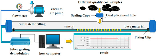 ① Equipment connection. The PVC pipe with a fiber-optic grating sensor was fixed on the drilling simulation platform, the grating encapsulation area was located at the side of the direct coal fall, and the fiber was connected to the debugged fiber-optic grating demodulator through the FC interface on the plug; the two ends of the drilling simulation platform were sealed with plugs to check the overall air tightness of the experimental system.