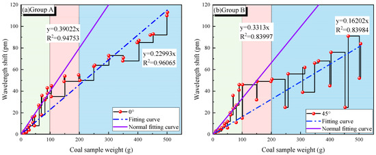 From the literature [43,44], it is known that when the fiber grating material is certain, the grating measurement center wavelength shift has a good linear relationship with the monitored strain; there is also a good linear relationship between the coal sample mass and the induced strain. In addition, it can be concluded that there is a linear correlation between the grating measurement wavelength shift and the coal sample mass, so the linear function is chosen to fit the scatter plot of each group of experimental data for analysis.