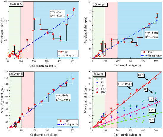 The masses of the coal samples selected in the experiment were 10, 20, 30, 40, 50, 60, 70, 80, 90, 100, 150, 200, 250, 300, 350, 400, 450, and 500 g. Although there were some differences in the coal samples taken in the experiment, the changes were not significant, so the five groups of experimental data were analyzed as a whole. In Figure 4f, it can be seen that the slope of the wavelength offset corresponding to 180° of sensor deflection is the largest, followed by 0°, 45°, and 135°, with 90° being the smallest, and the slope of the wavelength offset corresponding to 0° of fiber deflection is the largest when the mass of the coal sample is 0~100 g. This indicates that the knocking effect of the falling coal mass on the sensor is large, resulting in large errors in the sensor monitoring results, and when the sensor is deflected by 180°, it is protected by the substrate material, which greatly reduces the monitoring errors. At the same time, it can be seen that the matrix material serves to protect the sensor while reducing its monitoring data (i.e., slope reduction).