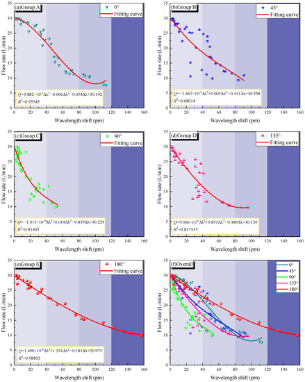 The flow rate can characterize the hole collapse situation: the more serious the hole collapse, the larger the wavelength offset and the smaller the flow rate. As can be seen from Figure 5, the fit between the wavelength offset and the flow rate for Groups B, C, and D is not high, which is due to the fact that the sensors are located on both sides of the matrix material and can only monitor part of the coal fall, resulting in a decrease in the borehole flow rate but a small change in the wavelength offset. The fit R2 = 0.95545 of the fitted curve of Group A indicates that the monitoring result of Group A is better and can characterize the hole collapse situation of the borehole, while it can be seen that the borehole flow gradually slows down with an increase in the wavelength offset, which is due to the direct knocking of the coal body by the falling coal causing certain damage to the wireless sensor, resulting in the slowdown of the borehole flow curve at a later stage. For the goodness-of-fit R2 = 0.98805 for the fitted curve of Group E, it is obvious that all the data are distributed around the fitted curve, and the approximate linear trend decreases, indicating that the monitoring results are most accurate at this time. As can be seen from Figure 5e, the sensor deflection angle is 180°, that is, when it is located in the lower part of the matrix material, the wavelength offset decreases simultaneously as the flow rate decreases, and the wavelength offset of the rest of the monitoring data cannot fully reflect the hole collapse situation of the borehole. It can be clearly seen from Figure 5f that the data fitting effect of Group E is the best. Based on the above study, the accuracy of the Group E grating point arrangement of the borehole collapse monitoring technology is proved again, that is, the grating points are arranged below the matrix material, and the relationship between the wavelength offset and the flow rate is .