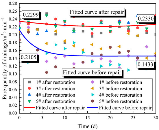 In Figure 8, the red line is the fitted curve of the extraction data after the drilling support, and the blue line is the fitted curve of the extraction data before the support. In this figure, only the pure extraction data before and after the support of Boreholes No. 1, No. 3, No. 4, and No. 5 are compared and analyzed, and it can be seen that there is a significant improvement in all of them. The average 30 day extraction volume of the borehole after the support was 0.2330 m3/min, which is 62.6% higher than 0.1433 m3/min before the support.