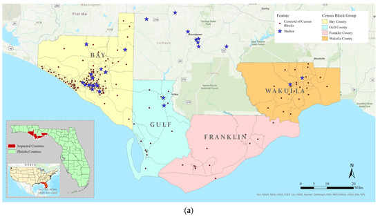 This paper studied the impact of Hurricane Michael, focusing on four coastal counties (shown in Figure 1a) in northwest Florida that are susceptible to hurricane storm surge impact. Among these counties, only Panama City—Panama City Beach in Bay County, and Crawfordville in Wakulla County were designated as 2020 Qualifying Urban Areas [31,32,33].