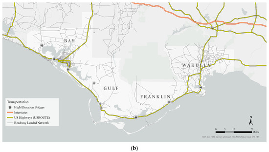 For travel cost calculation, we used the congested travel time on loaded roadway networks (shown in Figure 1b) for northwest Florida which was downloaded from FSUTMS Online website owned by the FDOT Forecasting and Trends Office [38]. This travel time consisted of the cost of travel in the Origin-Destination (OD) Matrix within ArcGIS from each census block group centroid (set as the Origin) to the statewide hurricane shelters [5] (evacuation destination of this SA research). Each origin in the study area was geocoded to its respective census block group and snapped to the roadway network. However, the destinations, which were provided by FEMA and had fixed addresses, were not allowed to be snapped to the network. As a result, some shelters were excluded from the analysis as they were located outside of the network’s coverage area and were not accessible to the population of impacted counties.