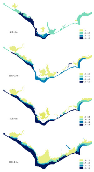 (2) It was assumed that the only effect of SLR would be to increase the hurricane’s direct impact. Other climatic conditions, such as the stability of atmospheric pressure, may also play a role in the formation of hurricanes, but they are not the focus of this study. To visualize the challenges that SLR posed for hurricane evacuations, the model only assumed the water elevation changes during hurricane development using different scenarios. Ease of evacuation and accessibility changes are subject to this single impact of SLR.
