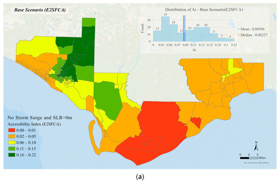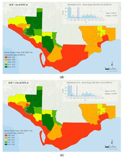 Accessibility Index of E2SFCA: (a) Base Scenario, (b) SLR = 0 m, (c) SLR = 0.5 m, (d) SLR = 1 m, and (e) SLR = 1.5 m.