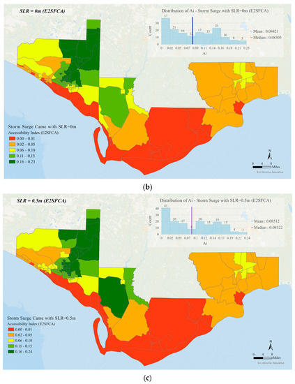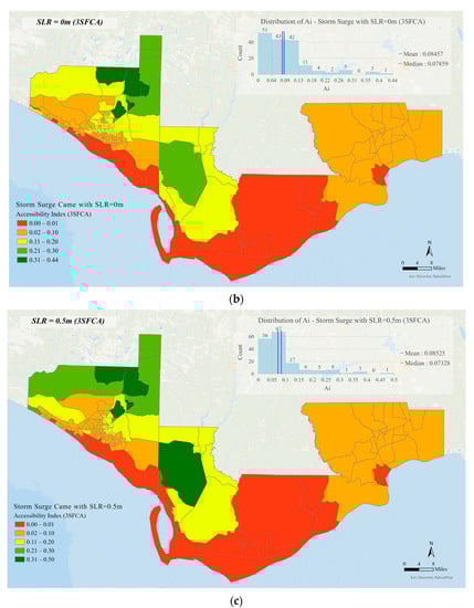Comparing the base scenario with SLR = 1.5 m scenario, the number of census block groups with higher in E2SFCA had an increasing trend. For instance, in Figure 3a, there were 4 block groups who had higher than 0.2 whereas it increased to 14 block groups whose values were higher than 0.2 in Figure 3e. However, the number of high census block groups in 3SFCA seemed to be stable when SLR increased. Looking at histograms in Figure 4a,e, the number of census block groups whose distribution is shown at the end where largest value interval was staying as 1. Moreover, this last interval of had a more skewed distribution compared to most of others, just like an undesirable value that should be taken out of consideration. It shows a function of 3SFCA, that applying a selection weight function in assessment may help to sieve out outlier values for further research.