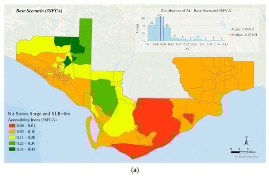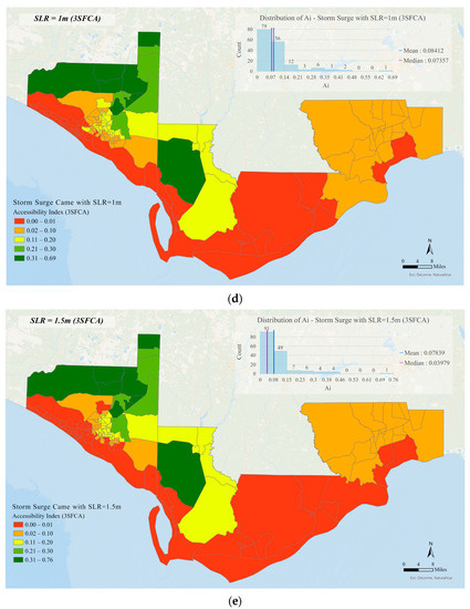Accessibility Index of 3SFCA: (a) Base Scenario, (b) SLR = 0 m, (c) SLR = 0.5 m, (d) SLR = 1 m, and (e) SLR = 1.5 m.