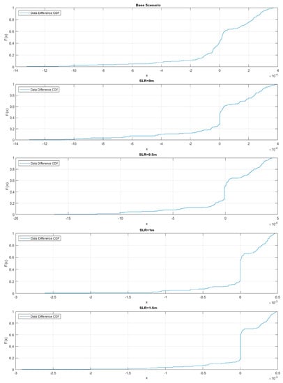 According to Figure 5, based on the difference between the two kinds of floating catchment area simulation, we cannot accept the null hypothesis that data was normally distributed. None of any set of accessibility index results provided a normal cumulative distribution. In addition, p-values during K-S test were smaller than among scenarios, providing another reason to reject normality. Note that base scenarios were related to original evacuations during blue sky days without SLR, while the other scenarios are either based on the inundation caused by Hurricane Michael at its observed strength or more severe inundation with additions of SLR. As such, the calculation results of the two methods have dived at the front end of the cumulative distribution. To present the differences of two sets of non-normally distributed results, a nonparametric statistic test, the Wilcoxon signed rank test was applied to conduct the required statistical analysis [44,45,46]. This test does not need to assume a specific distribution of the data and is suitable for nonnormal as well as skewed data, while it can observe the magnitude of the difference between variables. At the same time, the test has been known to perform well even with small sample sizes [47], suitable for the resulting data size of this study. For this research, the null and alternative hypotheses in this test were: