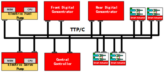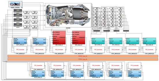 Figure 5), to meet the development and verification requirements of an aero-engine distributed control system. The integrated engine DCS model features dual channel system architecture, and each channel can individually control the engine with full authority and functionality. Each channel includes a central controller (EEC node), a front digital concentrator (DC1 node), a rear digital concentrator (DC2 node), sensors, and smart actuators. Pressure sensors are integrated in the digital concentrator. Other sensors such as LVDT, RVDT, thermal resistance, or thermocouple are traditional sensors, and their raw signals are collected by a digital concentrator to conduct AC/DC conversion and diagnosis, then packaged to broadcast to TTP network. The central controller is the brain of the whole system, which calculates the big closed-loop demands and makes decisions for the whole of the manipulations. The smart actuator node such as smart electric pump and RDDV valve receive the demands and control the fuel or location in small closed-loop.