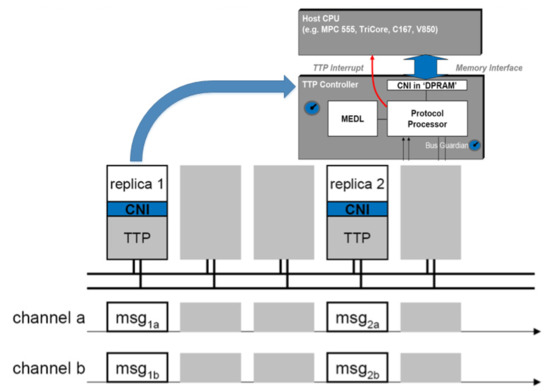 Figure 3 describes the fundamental principle of TTP/C bus protocol. The TTP/C bus is a kind of time-triggered protocol, featured with TDMA (time division multiple access). The physical bus has dual channels in architecture, and any SN in the network broadcast its information to each channel. A TTP SN includes a TTP controller, a host controller (including AS and OS), and a TTP CNI (container network interface). The MEDL information is stored in a TTP controller, which contains information of the cluster cycle, TDMA round, node slot allocation, and all scheduling in the network.