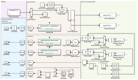 ® (Matlab Simulink R2017a), in which the bus signal flow can be simulated through “entity” to build a distributed network model so that simulating the bus network characteristics in DCS can be realized. Using SimEvents can solve the problems such as time-triggered TTP/C bus simulation and random bus fault injection simulation, and realize the system-integrated simulation of engine control, system timing, and distributed bus behavior. In addition, it supports bus fault random injection during operation, which provides convenience for function design, timing design, and security analysis of distributed architecture.