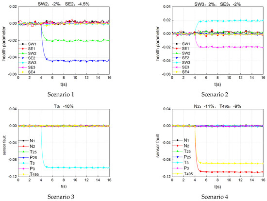 Figure 6. Scenario 1 simulates compressor fault, where flow decreases by 2% and efficiency decreases by 4.5%. Scenario 2 simulates high-pressure turbine fault, corresponding to a 2% increase in flow and a 2% decrease in efficiency. Scenario 3 simulates a −10% bias fault of T3 sensor; Scenario 4 simulates both N2 sensor and T495 sensor with −11% and −9% bias faults, respectively. In order to verify the estimation accuracy and the estimating speed of the observer, step faults are injected in the simulation to simulate abrupt engine faults. As can be seen from
