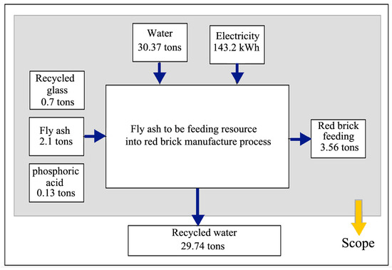 Here, according to the scope of this study, we turned the fly ash into red brick feed; the raw materials used in the system, the use of energy resources, and the discharge of pollutants are shown in Figure 2 after being sorted. Although recycled water is discharged, it will not pollute the environment because it is recycled and reused after discharge; the recycling process is not within the scope of this analysis.