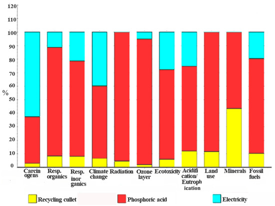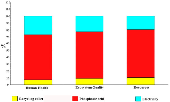 Land use is the impact of land development on the diversity of species on a unit of land. Here, the impact of land use is 6.33 × 10−4 PDF·m2·yr, of which recycled cullet contributes 11.6%, while phosphoric acid contributes 88.4%.