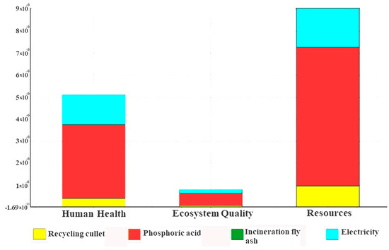 Fly ash is recycled into red bricks; therefore, the residual energy of minerals is 2.81 × 10−4 MJ surplus. Figure 3 shows that recycled glass and phosphoric acid contribute 43.4% and 56.6%, respectively. The recycling of fly ash resources into red brick feedstock causes damage to fossil fuels; thus, its residual energy is 7.58 × 10−2 MJ surplus. The contribution of recycled cullet is 10.4%, the contribution of phosphoric acid is 69.9%, and the contribution of electricity is 19.7%.