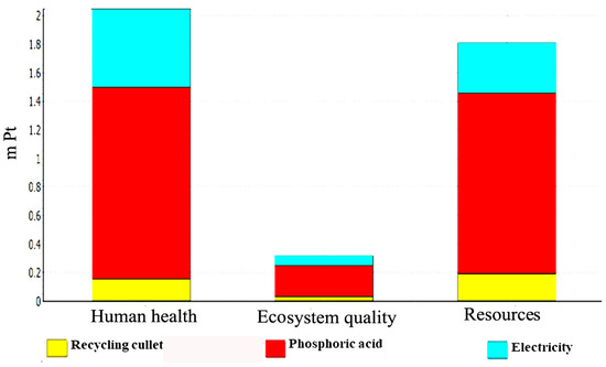 Climate change hazards, i.e., pollutants produced that cause climate change, impact people’s life expectancy to the degree of 1.33 × 10−8 DALY, of which phosphoric acid and electricity contribute 7.07 × 10−9 DALY and 5.23 × 10−9 DALY, or 53.3% and 40.1%, respectively. The impact on the human body caused by radiation hazards is 3.45 × 10−10 DALY, most of which is contributed by phosphoric acid. In addition, radiation enters the Earth’s atmosphere from outer space through holes in the ozone layer and causes human bodily harm; this damage is 3.26 × 10−11 DALY. Figure 3 shows that phosphoric acid contributes the largest proportion of environmental load: 92.8%.