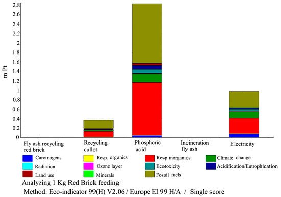 The raw materials and energy resources used in the manufacture of fly ash as a raw material for red bricks are discharged, and the ecologically toxic substances are discharged into the atmosphere, water, and soil, causing damage to the ecosystem of 1.85 × 10−2 PAF·m2·yr. The proportions of environmental load contributed by phosphoric acid and electricity are 66.3% and 27.9%, respectively.