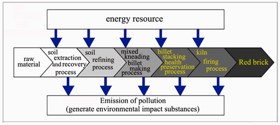 For the convenience of research, the functional units of the red bricks, environmentally friendly red bricks, and second-generation environmentally friendly red bricks were all defined the same; the production of 1 kg of red bricks was the basic unit.