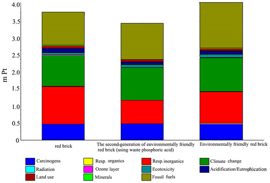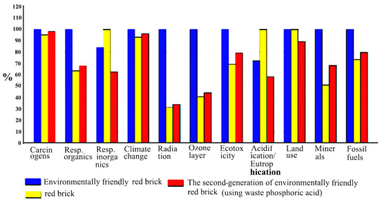 After performing the evaluation and comparison, we can clearly see that the environmental load of red bricks produced today is not much different from that of environmentally friendly red bricks (only about 7.43%), and most of the pollution caused by the manufacture of environmentally friendly red bricks is from the use of phosphoric acid. Therefore, from the perspective of research and development, if it is assumed that waste ammonium dihydrogen phosphate is used to make red bricks, it can be seen from Figure 16 that the overall environmental load of second-generation environmentally friendly red bricks is smaller than that of ordinary red bricks; the simulation indicated that this could reduce pollution by approximately 8.75%, meaning that research and development in this field is still promising.
