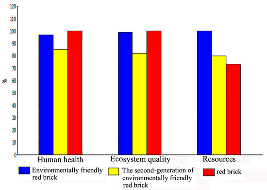 Figure 12 indicates that the level of carcinogenic damage caused by the environmentally friendly red bricks is higher than that caused by the second-generation environmentally friendly red bricks, while that caused by the red bricks is the lowest, although the ratio between the three is almost the same. Red bricks are significantly better in terms of environmental protection; in terms of inhalable inorganic substances, red bricks produce the highest amounts, assumed to be mainly the dust emitted during the manufacturing process. There is little difference between the three in terms of climate change impacts. Regarding the aspects of radiation and the ozone layer, the environmentally friendly red bricks have the greatest impact. Concerning ecological toxicity, the environmentally friendly red bricks are the most toxic, while the least toxic are the red bricks. In terms of acidification/optimization, the red bricks have the greatest influence. The effects of all three bricks are almost the same in terms of land use. The greatest mineral influences are from the environmentally friendly red bricks. The impact of the environmentally friendly red bricks is the greatest, that of the second-generation environmentally friendly red bricks is second, and the normal red bricks have the lowest impact. Finally, the impact of environmentally friendly red bricks in raw petrochemical materials is the largest, that of second-generation environmentally friendly red bricks is second, and that of red bricks is the lowest.