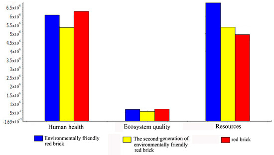 As shown in Figure 15, after weighting, the red bricks had a human health impact of 2.51 × 10−3 Pt, an ecosystem quality impact of 2.76 × 10−4 Pt, and a resource consumption value of 9.88 × 10−4 Pt; the environmentally friendly red bricks had a human health impact of 2.43 × 10−3 Pt, an ecosystem quality impact of 2.74 × 10−4 Pt, and a resource consumption value of 1.35 × 10−3 Pt; the second-generation environmentally friendly red bricks had an ecosystem quality impact of 2.27 × 10−4 Pt and a resource consumption value of 1.08 × 10−3 Pt.