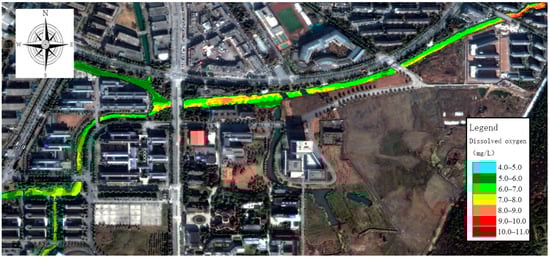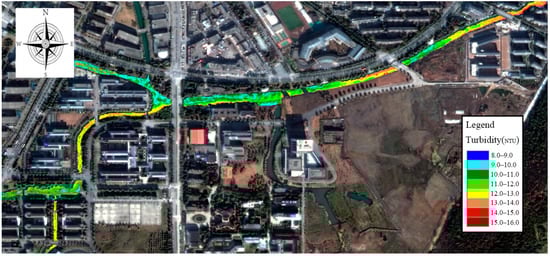 Figure 7). This experimental river channel extends from the southwest to northeast direction. Due to the confluence of tributaries from the northwest direction and the obvious widening of the channel, the turbidity of the water body decreased and dissolved oxygen increased, and the water quality of the river improved significantly. We also found that the turbidity was higher at the river boundary and lower in the middle of the river, which is also consistent with the field research results. Combining with the field sampling information, we concluded that the inversion results of this paper can better reflect the spatial distribution characteristics of urban river-water quality.