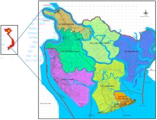 In Vietnam, mangroves occupy a vital position in the national territorial structure, having particular functions in the country’s development, and are a source of livelihood for several local communities [,]. Vietnam has a coastline of 3250 km with many estuaries leading to the sea, so there is a relatively large area of mangrove forest. However, mangroves in Vietnam have been significantly degraded over the past 20 years due to economic development and poor management. It is estimated that in the period 2000–2020, about 200,000 hectares of mangroves were destroyed []. Although the importance of mangroves is recognized in many conservation policies and regulations, they are still being destroyed at a remarkable rate due to the activities of agriculture, construction, transport, tourism and urbanization. In addition, due to the impact of natural disasters in the context of climate change, mangroves are also being significantly degraded, thereby causing a decrease in the quantity and quality of ecological services and economic values provided to local communities [,].