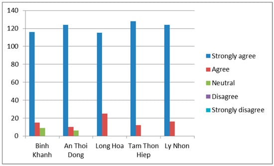 According to the survey results (Table 3), up to 79.5% of the interviewees in the sample chose the opinion “Strongly agree that mangrove forest must be preserved”. Even in An Thoi Dong and Tam Thon Hiep communes, almost all of the interviewees completely agreed that mangroves should be conserved. Only 15 people had an unclear attitude, and no one opposed the protection of the mangrove forest (Figure 2).