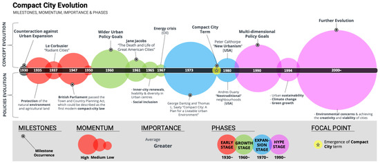 The notion of the compact city has arisen as a prominent paradigm across numerous fields of research, including urban studies, sustainability, environment, transportation and mobility, public health, and public services, among others, for several decades [1,2]. This has led to widespread discourse and deliberation among scholars, policymakers, and academia in general. This broad interest and attention can be attributed not only to the vast and diverse range of disciplines encompassed by the compact city research field but also to the origins and underpinnings of this urban concept, as well as the varying definitions and interpretations that have emerged over time.