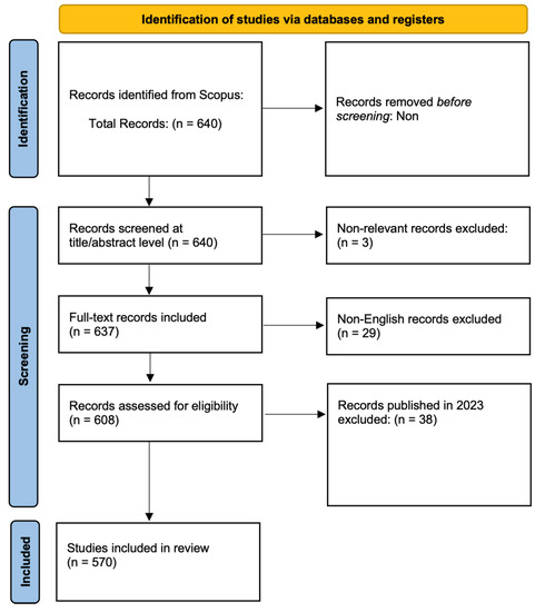 Figure 2 illustrates the PRISMA flow diagram, which outlines the process of selecting relevant studies for bibliometric analysis. The diagram demonstrates the progression from the initial search to the final 570 studies related to compact cities that were suitable for the application of the bibliometric analysis approach.