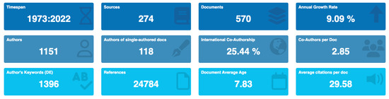 These 570 documents were published between 1973 and 2022 and originated from diverse sources, including 274 journals or conferences. Additionally, these records exhibited an annual growth rate of 9.09% and an average citation per document of 29.58, indicating an increasing interest in the study of the compact city concept over time. The dataset involved the contributions of 1151 authors, reflecting the collaborative nature of research in this field. Out of these authors, 118 were responsible for single-authored documents, while collaboration was observed in 146 documents, with an average of 2.85 coauthors per document. The dataset also exhibited a rich set of keywords, including 2655 Keywords Plus (ID) and 1396 Author Keywords, indicating the comprehensive coverage and depth of the compact city literature. Figure 3 presents the key information and insights derived from the collected articles. With the dataset and its general information established, the subsequent sections of this article will delve into the various bibliometric analysis levels and analytical units utilized to further explore and understand the research landscape of the compact city concept.