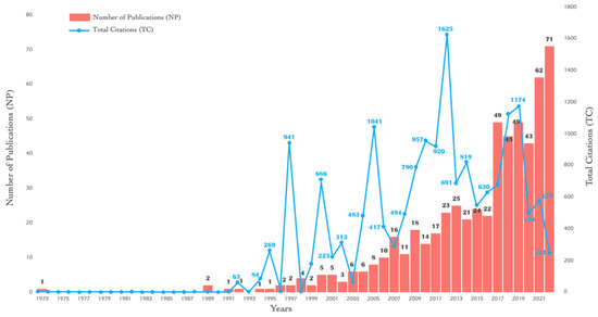 The analysis of annual scientific production in the field of compact city literature reveals notable trends in publication output and citation impact. The data presented in Figure 4 show a gradual increase in publications and citations over the years. During the early years, there was limited activity, with only a handful of articles discussing the compact city concept, resulting in minimal citation counts. For example, from 1973 to the early 1990s, a total of five articles were published, receiving a mere 70 citations. However, from the 1990s onwards, there was a notable rise in both the number of articles published and the corresponding citations received. The published articles in this period received varying numbers of citations, ranging from 84 citations in 1994 to 941 citations in 1997. The year 2000 and onwards witnessed a substantial increase in both the number of publications and citations. Multiple articles were published annually, with the highest number recorded in 2022, with 71 articles. The corresponding number of citations also showed a rising trend, reaching its peak in 2012, with 1625 citations. Overall, these findings indicate a growing interest and recognition of the research conducted within the compact city literature domain. The increasing publication output and citations indicate a rising awareness of the benefits and potential of compact cities in addressing urban sustainability, energy efficiency, transportation planning, and other related topics. Figure 4 provides a comprehensive overview of the evolution of published articles and their corresponding citation counts in the compact city literature from 1973 to 2022.