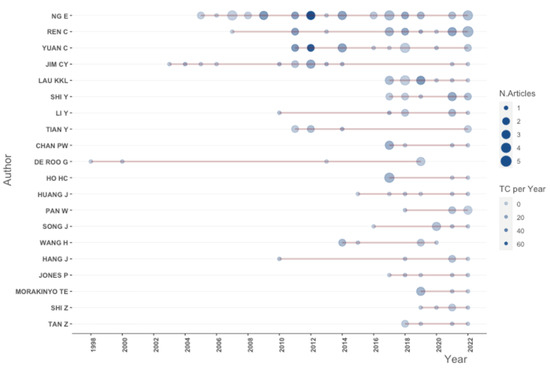 Chronological representation of the most productive authors in the field of compact city literature. N. Articles: refers to the number of publications; TC per Y: refers to the total citations per year. Red line: refers to the specific period in which the author was actively involved in publishing articles.