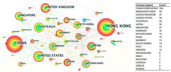 Examining the country (region) analysis in the context of the compact city literature, Figure 7 showcases the country (region) collaboration network involving 53 countries (regions). Notably, China-Hong Kong emerges as the top contributor, with 106 published articles, followed closely by mainland China, with 90 publications. The United Kingdom secures the third position, with a significant number of publications (n = 37), while the United States, Australia, Japan, and Singapore follow closely, with 36, 33, 32, and 27 published articles, respectively. The prominence of Asian countries (regions) at the top of this list, including China-Hong Kong, mainland China, Japan, Singapore, and South Korea, among others, highlights the global reach and significance of the compact city concept. It further signifies the importance of compact urban environments within the urban systems of these countries (regions).