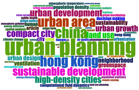 Keyword analysis is widely recognized as a fundamental aspect of bibliometric analysis studies. This analytical unit is crucial in examining the patterns, trends, and relationships within the literature, enabling researchers to gain a comprehensive understanding of the research content [50]. In the context of the compact city concept, Figure 8 presents a word cloud showcasing the prominent keywords in scientific production. The top keywords include urban planning (n = 146), China (n = 97), Hong Kong (n = 95), urban area (n = 90), and sustainable development (n = 75). Other notable keywords, such as compact city, urban development, high-density cities, and land use, also feature in the word cloud. Notably, while “compact city” synonyms do appear, they do not dominate the list, with keywords emphasizing the urban perspective of compact cities taking precedence. This finding suggests a strong emphasis on understanding compact cities from an urban perspective as the core aspect of the concept. Additionally, these domain-specific keywords address the core debates, concepts, and shortcomings in the field of compact city research. For example, the prominence of “China” and “Hong Kong” as keywords may indicate a focus on studying compact cities within the context of rapid urbanization and urban challenges in these regions. Researchers might explore issues such as high-density development, urban governance, and sustainable urban growth within these specific contexts. Additionally, such keywords as smart cities, public transportation, social equity, and green infrastructure shed light on emerging areas of interest and research within the compact city literature.