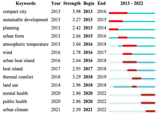 Another aspect of investigating and exploring the keywords in specific literature is the keyword burst. Keyword burst refers to a sudden increase in the frequency of a particular keyword compared to its usual occurrence within a specific time period. In the context of the compact city literature, Figure 9 illustrates the occurrence of keyword bursts, highlighting the rapid surge in the frequency of certain keywords [34]. The analysis reveals that keyword bursts in the compact city literature started in 2013 and continued until 2022, with no specific-interest keywords identified prior to that period. Notably, the strongest citation bursts were observed for keywords such as compact city, thermal comfort, sustainable development, and atmospheric temperature. Furthermore, examining the beginning and end of the burst period reveals two distinct phases. From 2013 to 2018, the burst keywords primarily focused on the urban dimension of the compact city concept. However, from 2018 to 2022, the burst keywords shifted towards the environmental dimension of the compact city concept, including keywords such as heat island, thermal comfort, and mental and public health.