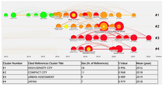 Reference analysis, a bibliometric analysis unit, aims to understand the influential sources and intellectual foundations of the compact city scientific field [50]. To explore the cited references within the compact city literature, the clustered co-citation network is employed. This visualization tool examines the evolution and interconnections of referenced studies over time. Figure 10 illustrates the cluster co-citation references, which groups the documents forming the compact city literature into distinct clusters based on timeline periods. The largest cluster, labelled “High-Density City,” comprises 18 references and exhibits high homogeneity (silhouette value of approximately 0.996). This cluster focuses on spatial issues related to compact cities, including heat, urbanization, wind, and ventilation. The primary cited reference within this cluster is [62], along with other notable references, such as [63,64,65]. The second cluster, labelled “Compact City”, consists of 11 references that support studies discussing the fundamental concept of compact cities. References such as [30,66,67] contribute to this cluster. The third cluster, labelled “Urban Assessment”, comprises nine references, including [68,69], focusing on evaluating the issues associated with compact cities as urban environments. The fourth and final cluster, labelled “Japan”, encompasses seven references, including [70,71,72]. This cluster presents diverse perspectives on the compact city concept, particularly in Asian countries (regions), with a focus on China-Hong Kong and Japan. Analyzing the references related to compact cities is of great importance, as it allows researchers to identify the influential works and intellectual foundations that have shaped the field. By understanding the key references and their interconnections, researchers can trace the evolution of ideas, identify seminal works, and explore the conceptual development of the compact city literature. This analysis provides a solid foundation for future research by highlighting the existing knowledge base and identifying research gaps. For example, by examining the references within the “High-Density City” cluster, researchers can gain insights into the spatial aspects of compact cities, including considerations of urban form, climate, and environmental sustainability. This information can inspire further studies on topics such as urban microclimates, green infrastructure, and sustainable urban design. Another example is found within the “Compact City” cluster, where researchers can explore the foundational literature on the concept of compact cities. By examining the references in this cluster, researchers can delve into the theoretical frameworks, policy implications, and empirical evidence that underpin the concept of compact cities, providing a solid basis for future research and policy development.