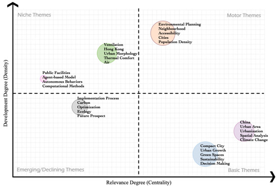 The primary objective of this analysis unit is to uncover the prominent topics, concepts, and research areas within the compact city literature. The unit utilizes two analytical techniques: thematic map and factorial analysis. The thematic map visualizes the relationships among different thematic clusters and categorizes the most cohesive keywords into four quadrants: emerging/declining themes, basic themes, motor themes, and niche themes [73]. Within the emerging/declining quadrant, themes such as ecology, optimization, and carbon are found. These themes have low density and centrality, suggesting that they are either weakly developed or on the periphery of the compact city discourse. For instance, the optimization theme has been extensively explored, and further research may be shifting toward other aspects of compact city development. The ecology and carbon themes, on the other hand, are emerging, indicating a growing recognition of environmental sustainability and ecosystem preservation in the context of compact cities. The basic themes quadrant includes fundamental topics, such as compact city, urban area, sustainability, and spatial analysis, which form the core principles and areas of focus in the study of compact cities. In the motor themes quadrant, topics such as environmental planning, accessibility, and population density are located. These topics are both well developed and important within the compact city literature, representing dynamic and evolving research areas that actively contribute to the advancement of knowledge in the field. Lastly, the niche themes quadrant includes topics with well-developed internal ties but limited external significance. Examples include ventilation, urban morphology, public facilities, and autonomous behavior, indicating researchers’ in-depth exploration of specific areas within these topics. Figure 11 depicts the thematic map of the compact city literature.