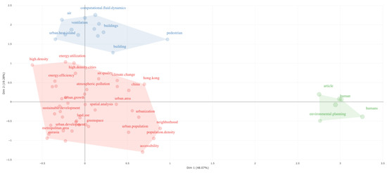 The factorial analysis, depicted in Figure 12, serves as the second analytical technique employed in this literature dimensions and themes analysis. It aims to uncover underlying dimensions or factors that characterize the compact city literature, providing deeper insights into the various research dimensions within this field [74]. The factorial analysis reveals three main clusters: red, blue, and green. The red cluster, the largest, encompasses numerous themes related to compact cities that emphasize the urban perspective and energy and environmental aspects. The blue cluster focuses on the essential components of compact cities, including air quality, buildings, and pedestrian infrastructure. Lastly, the green cluster comprises themes that explore the interaction between residents and the compact city environment, such as human behavior and environmental planning. These clusters shed light on the diverse dimensions and themes within the literature on compact cities.