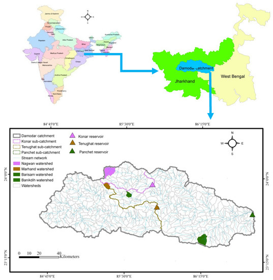 The Damodar catchment is a part of the Damodar River in the Jharkhand state of India (Figure 1) in the eastern part of the country. The catchment lies between the latitudes of 23°34′0″ and 24°91′0″ north and longitudes of 84°42′0″ and 86°46′0″ east. The catchment covers an area of 10,878 km2 with an elevation variation between 122 and 1340 m above mean sea level. Daily temperatures vary between a minimum of 3 °C and a maximum of 44 °C, with an average annual rainfall of 1250 mm over the area. Most of the rainfall occurs during the monsoon season (July to September), which accounts for more than 80% of the annual rainfall. The vegetation of the study area comprises mixed forest, mainly deciduous and tropical moist forest. There are rainfed agricultural activities, along with irrigated areas, which are supplied by multipurpose reservoirs in the catchment, including the Konar, Tenughat and Panchet reservoirs.